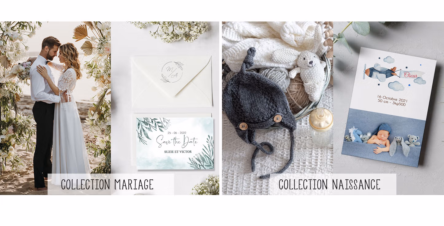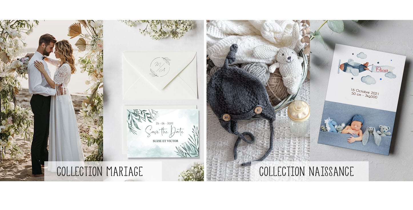 Faites part avec originalité avec nos collections pour toutes les occasions. Que ce soit pour annoncer la naissance de votre enfant, la célébration de votre mariage, un baptême ou encore un anniversaire, vous trouverez votre bonheur.
